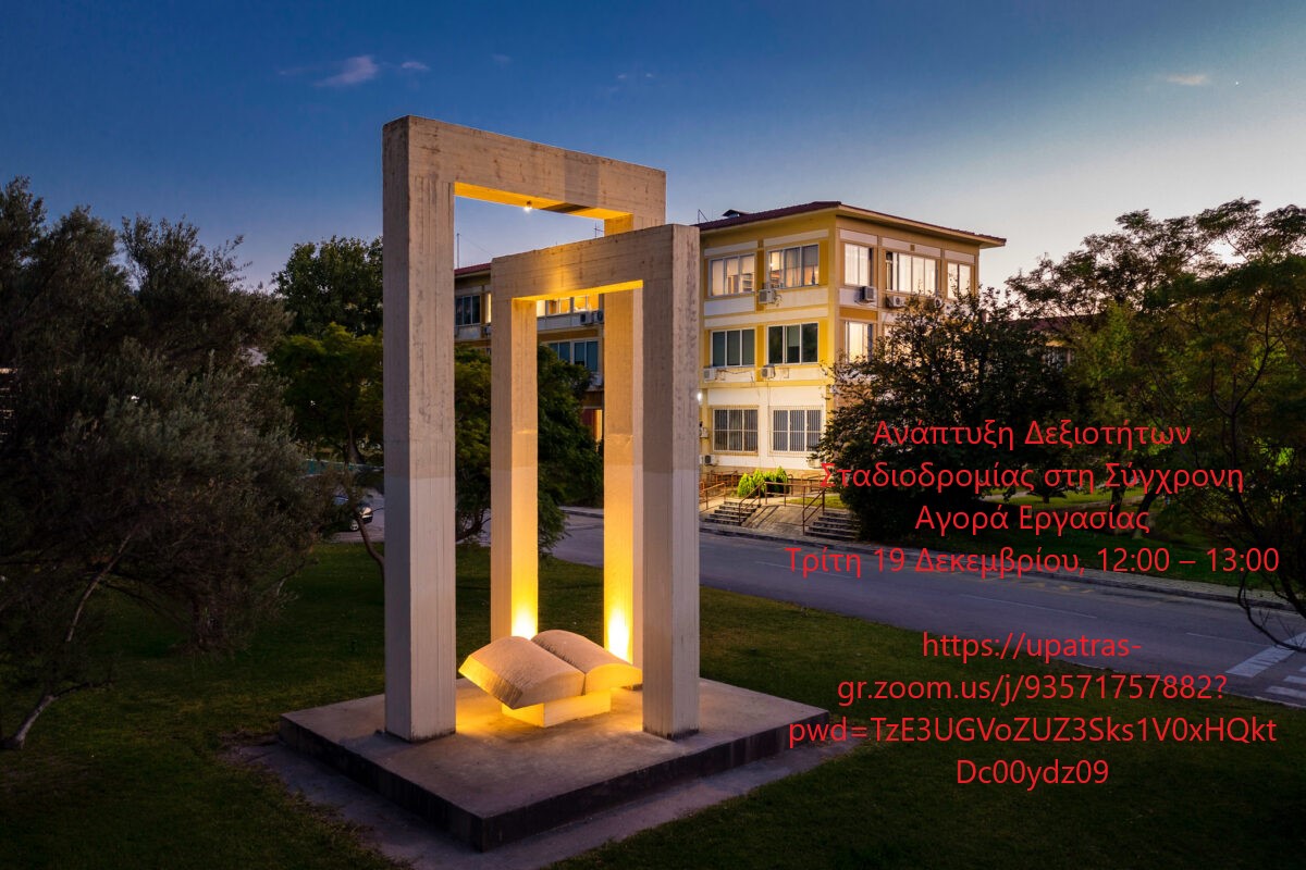 Το Τμήμα Υποστήριξης Φοιτητών, Απασχόλησης, Σταδιοδρομίας και Διασύνδεσης, της Διεύθυνσης Εκπαίδευσης και Έρευνας,  διοργανώνει διαδικτυακή δράση με θέμα: «Ανάπτυξη Δεξιοτήτων Σταδιοδρομίας στη Σύγχρονη Αγορά Εργασίας», για φοιτητές/τριες και αποφοίτους/τες του Πανεπιστημίου Πατρών, την Τρίτη 19 Δεκεμβρίου, 12:00 – 13:00.