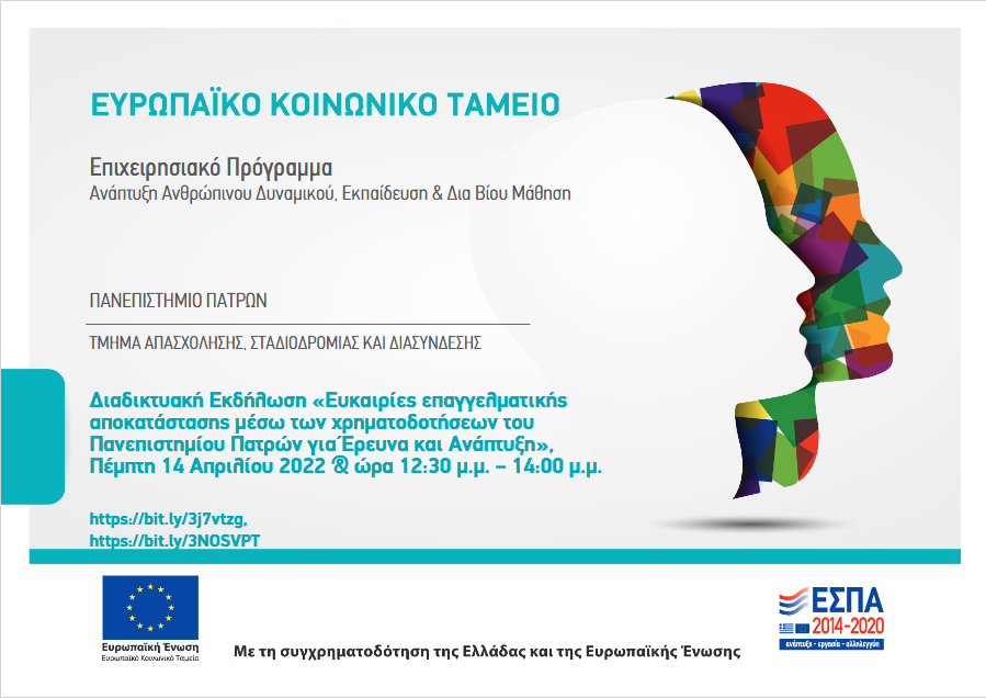 Στο πλαίσιο της Πράξης «Γραφείο Διασύνδεσης Πανεπιστημίου Πατρών», το Τμήμα Απασχόλησης, Σταδιοδρομίας και Διασύνδεσης, της Διεύθυνσης Εκπαίδευσης και Έρευνας, θα υλοποιήσει διαδικτυακή εκδήλωση με θέμα: «Ευκαιρίες επαγγελματικής αποκατάστασης μέσω των χρηματοδοτήσεων του Πανεπιστημίου Πατρών για Έρευνα και Ανάπτυξη», την Πέμπτη 14 Απριλίου 2022 και ώρα 12:30 μ.μ. – 14:00 μ.μ..