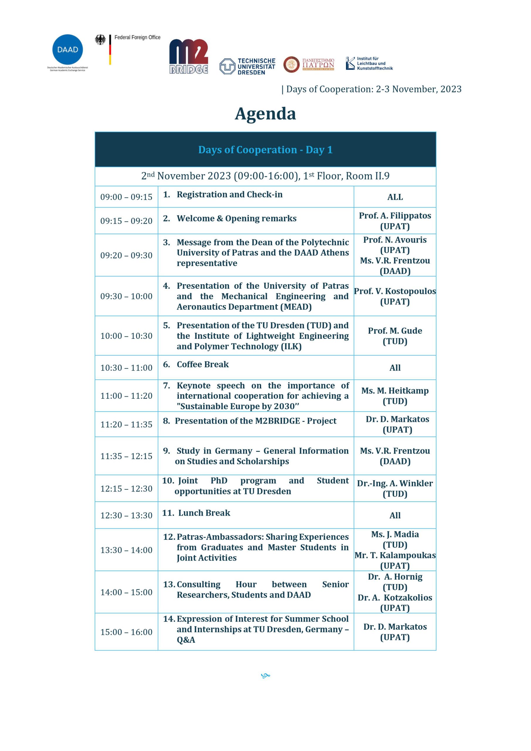 στο οποίο συμμετέχουν το Πολυτεχνείο της Δρέσδης (TUD) και το Πανεπιστήμιο Πατρών (UPAT), οι “Ημέρες Συνεργασίας” σχεδιάστηκαν για την προώθηση της συνεργασίας, τη διευκόλυνση της ανταλλαγής γνώσεων και την εξερεύνηση πιθανών πεδίων συνεργασίας μεταξύ των δύο πανεπιστημίων, με έμφαση στις επιστήμες μηχανικών.Η παραπάνω εκδήλωση θα λάβει χώρα στο συνεδριακό κέντρο του Πανεπιστημίου Πατρών, στις 2 και 3 Νοεμβρίου 2023, και είναι ανοιχτή για όλη την πανεπιστημιακή κοινότητα, κυρίως στους φοιτητές που επιθυμούν να εξερευνήσουν πιθανές συνεργασίες με το Πανεπιστήμιο της Δρέσδης, όπως πρακτικές, κοινές διδακτορικές σπουδές και άλλες κοινές πρωτοβουλίες στις επιστήμες μηχανικών. Η εκδήλωση θα πραγματοποιηθεί στην αγγλική γλώσσα και το αναλυτικό πρόγραμμα μπορείτε να το βρείτε εδώ (επισυναπτόμενο pdf)Η είσοδος είναι δωρεάν.